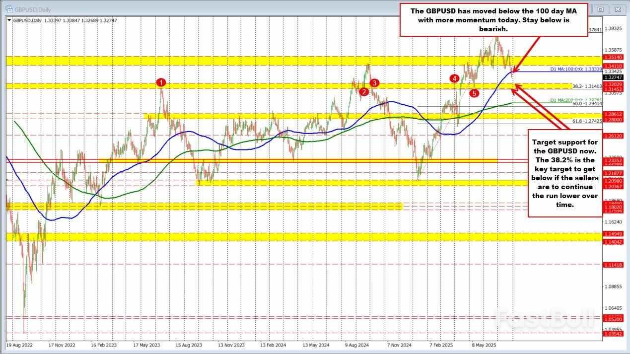 The GBPUSD is extending to a new low today, as bearish pressure intensifies technically. This move is significant because the pair is now trading below its 100-day moving average, currently at 1.33339. That level had acted as a temporary floor yesterday, with buyers stepping in to defend it. However, today's price action shows a shift in sentiment, with sellers gaining more control and pushing the pair lower.