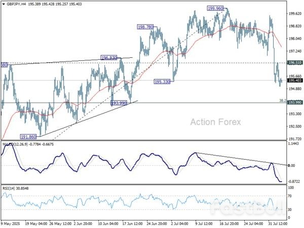 GBP/JPY’s fall from 199.96 short term top continues today and intraday bias stays on the downside. Deeper fall should be seen to 193.99 cluster support (38.2% retracement of 184.35 to 199.96 at 193.99). Strong support should be seen there to bring rebound, at least on first attempt. On the upside, above 196.51 resistance will turn intraday bias neutral again first. However, sustained break of 193.99 will raise the chance of near term bearish reversal.