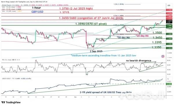The price actions of the sterling have staged the expected recovery against the US dollar, as the GBP/USD has rallied by 1.2% and almost hit the lower limit of our highlighted resistance zone of 1.3650/1.3680 (printed an intraday high of 1.3645 on Tuesday, 16 September 2025, at the time of writing).