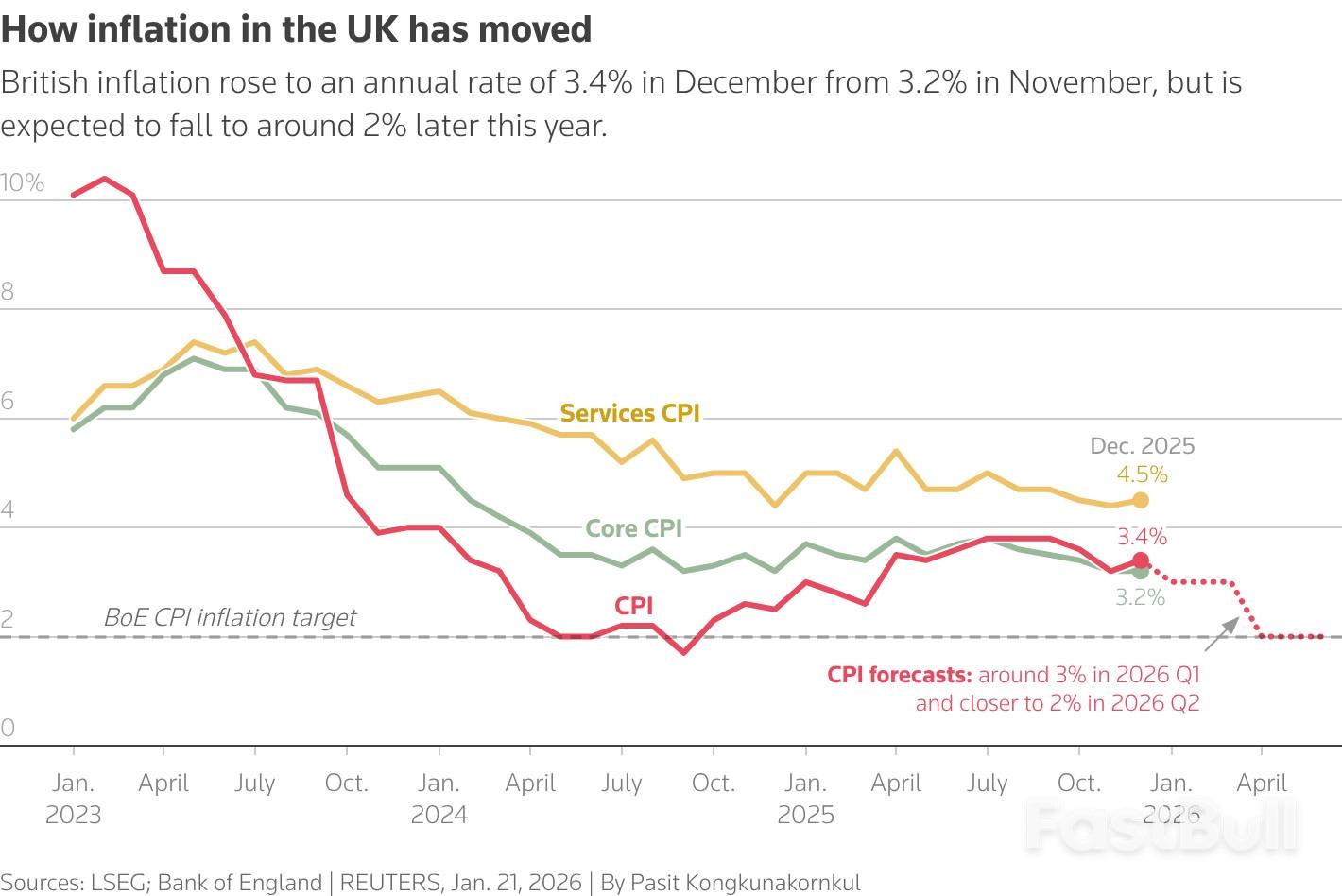 UK inflation unexpectedly climbed for the first time since July, hitting 3.4% in December and complicating the path toward price stability. Despite the increase, investors and economists largely believe the upward blip won't derail the Bank of England's plan to cut interest rates later this year.