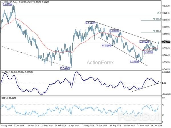 Firm break of 0.5852 will resume the whole rally from 0.5580 and target 100% projection of 0.5580 to 0.5852 from 0.5710 at 0.6015. Decisive break of 0.6015 will solidify that NZD/USD is in an impulsive move that should be resuming whole rise from 0.5484 (2025 low) through 0.6119. In any case, outlook will now stay bullish as long as 0.5710 support holds.