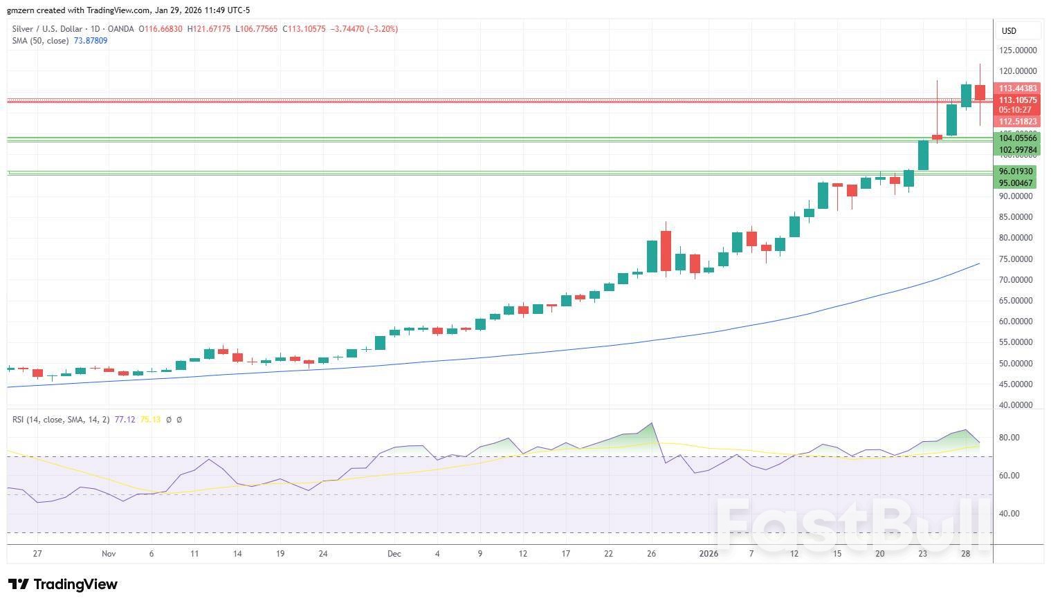 Silver’s moves were even more pronounced. Spot silver crashed 6.5% to $100.02 an ounce after setting a new record of $121.65 earlier in the day.