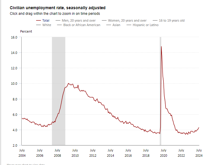 As far as economic signals go, the U.S. unemployment rate has moved up from 3.5% early in the summer of 2023 to a current 4.3%. This has triggered the so-called Sahm Rule. This rule states, "that the economy is in recession when the unemployment rate's three-month average is a half percentage point above its 12-month low." It has reliably been triggered during all the recessions since the 1950s.