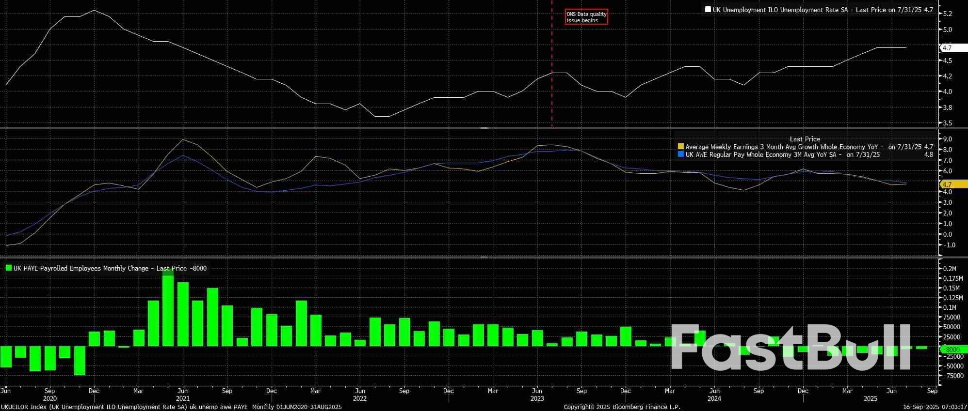 The figures are also unlikely to meaningfully alter the near-term Bank of England policy outlook, with Bank Rate set to be maintained at 4.00% in a 7-2 vote this Thursday; the MPC will have had advanced sight of today's data in any case. The next 'live' MPC meeting shan't come until November where, providing the current 'gradual and careful' guidance is maintained this week as expected, a 25bp cut remains the base case. That, though, hinges almost entirely on the inflation outlook, most importantly the September CPI print due 22nd October, where a print at, or below, the BoE's current peak 4% forecast will be required in order for further easing to remain on the cards this year.