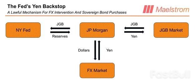 Hayes theorizes that the Fed could intervene through a specific mechanism to strengthen the yen and lower Japanese bond yields. The process would involve: