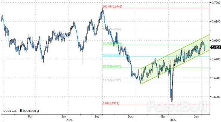 De dikke mist rond de economische toekomst is allesbehalve verdwenen maar de RBA wordt iets minder pessimistisch, vooral over het binnenlandse gegeven. Het afgelopen half jaar leverde bijvoorbeeld de bevestiging van het verhoopte herstel in private consumptie dankzij de nog steeds sterke arbeidsmarkt. Tegelijk zag de RBA in het meest recente maandelijkse inflatiecijfer risico’s dat het tweedekwartaalcijfer – de meest volledige en daardoor geprefereerde maatstaf – hoger uitvalt dan verwacht. De publicatiedatum is 30 juli. En dus wacht de RBA liever nog even tot de volgende vergadering op 12 augustus (incl. nieuwe voorspellingen). De centrale bank stelde in mei een landingszone voor de beleidsrente van 3.2% in 2026 voorop, ofte nog 2 à 3 renteverlagingen vanaf het huidige niveau. O.b.v. de communicatie deze week zien we dat voor de update in augustus meer als een bodem dan plafond. De markt loopt een eind voorop (4 à 5 verlagingen), wellicht geïnspireerd door de moeilijke context in Australië’s belangrijke Chinese handelspartner. Tegenover de Amerikaanse dollar, die tegen verminderde rentesteun aankijkt later dit jaar, kan de Australische naamgenoot daardoor waarschijnlijk beter stand houden dan tegen de euro. AUD/USD vervolgt het traject hoger in een gecontroleerd opwaarts hellend handelskanaal. EUR/AUD is mogelijks aan een periode van consolidatie toe binnen 1.70-1.80/85.