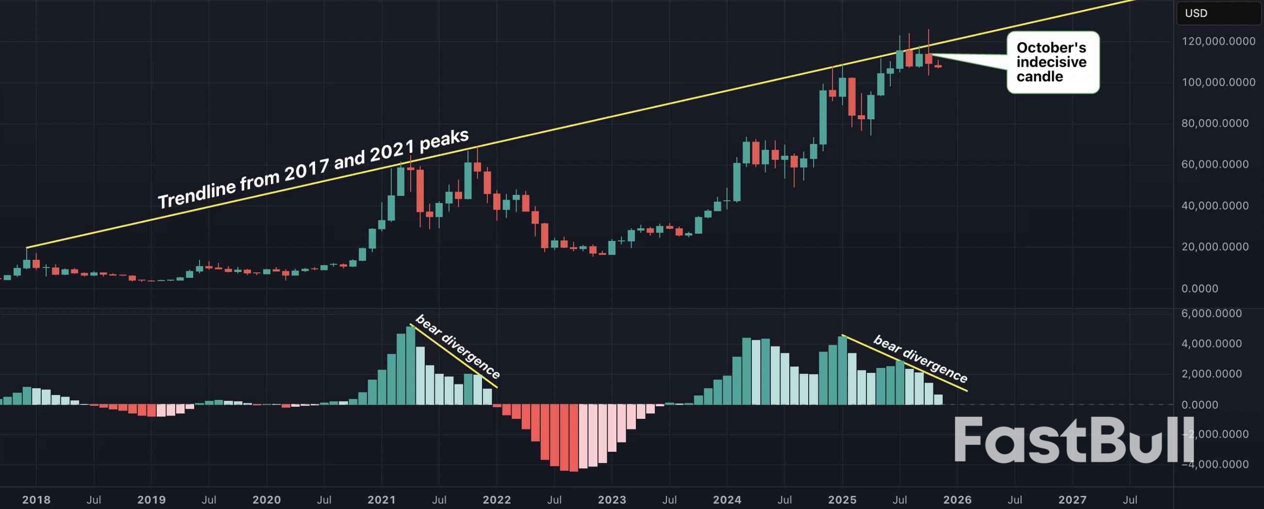 Bitcoin's monthly chart has recently exhibited a rare pattern marked by significant market indecision. The October candlestick presented an enormous price range between $103,600 and $126,000, catching both bulls and bears off guard. However, the month closed with a modest decline of only 3.8%. This wide price movement followed by a close near the month's opening price has been referred to as an "indecision candlestick" among analysts.