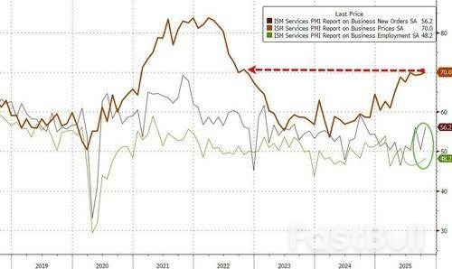 Under the hood, Prices surged to their highest in three years, new orders expanded at their fastest pace in a year and employment improved (though remained below 50)...