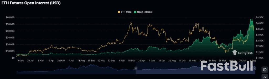 ETH futures open interest has steadily increased since June, aligning with price gains across spot and derivative markets. Data from Coinglass confirms a surge in open interest, which reached multi-year highs as ETH neared $4,500. This pattern reflects strong market participation and capital inflows.