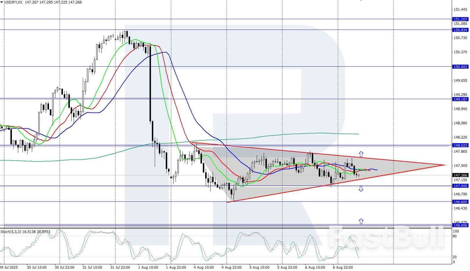 The USDJPY rate is declining, falling to the support area around 147.00 amid general dollar weakness and positive data from Japan. Find out more in our analysis for 7 August 2025.