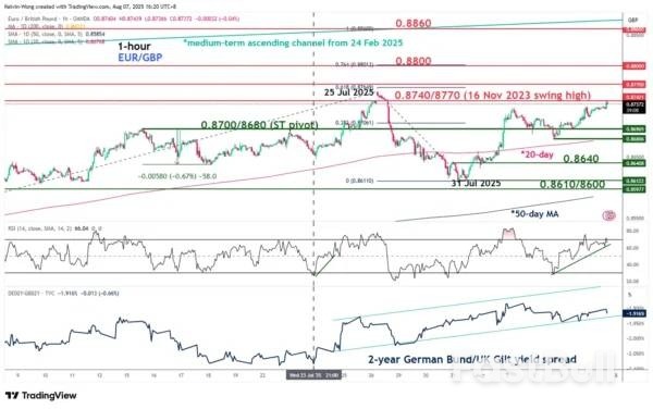 A break below 0.8680 negates the bullish tone, where the EUR/GBP may see a minor slide to retest the next intermediate supports of 0.8640 and 0.8610/8600 (31 July 2025 minor swing low and 50-day moving average).