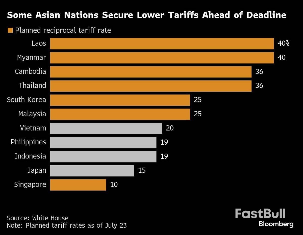 The latest deals “continue the trend of tariff rates gravitating towards the 15-20% range that President Trump recently indicated to be his preferred level for the blanket rate instead of 10% currently,” Barclays plc analysts including Brian Tan wrote in a note. That skews risks to GDP growth forecasts for Asia “to the downside,” they wrote.