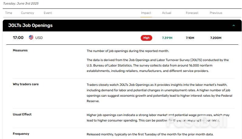 On June 3, 2025, the U.S. released JOLTs Job Openings report for April. The report indicated that JOLTs Job Openings increased from 7.20 million in March to 7.391 million in April, compared to analyst forecast of 7.10 million.