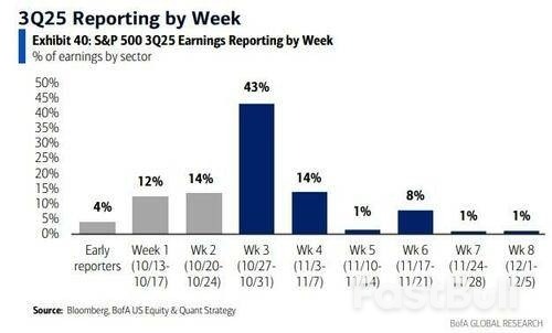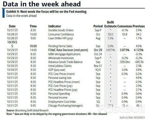 Finally, looking at just the US, several key data releases will almost certainly be postponed this week because of the government shutdown, including the durable goods report scheduled for release on Monday, the advance goods trade balance scheduled on Wednesday, the Q3 advance GDP report scheduled on Thursday, and the core PCE inflation scheduled on Friday. The Department of Labor will also postpone the official release of the jobless claims report if the government shutdown continues through Thursday, but preliminary state-level claims data will likely be available. There are no speaking engagements by Fed officials this week, reflecting the FOMC's blackout period.