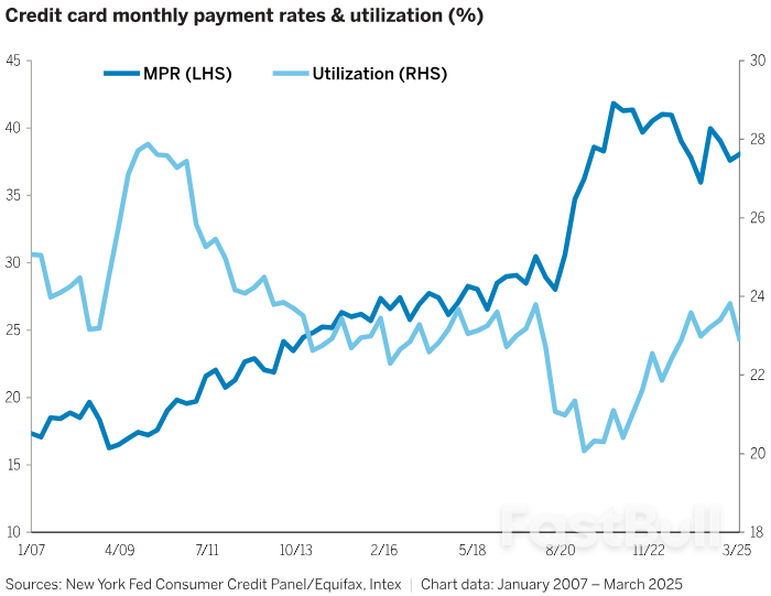 The gap between the performance of higher-income consumers and lower-income cohorts is widening. Lower-come households are experiencing duress due to affordability challenges, which in turn are leading to higher delinquency rates and more reliance on credit. Other cohorts remain relatively healthy. As the chart below shows, credit card utilization and payoff rates — both of which tend to be effective performance measures — are healthy. Utilization, while higher than in recent years, has normalized. Credit card monthly payment rates remain elevated relative to history.