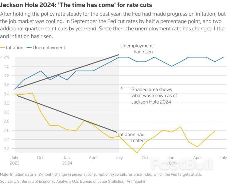 With Fed Chair Powell's speech at Jackson Hole on Friday watched closely for any signal about a resumption of Fed easing, the two key metrics on unemployment and inflation have changed little since the 2024 setpiece that flagged the first series of Fed cuts.
