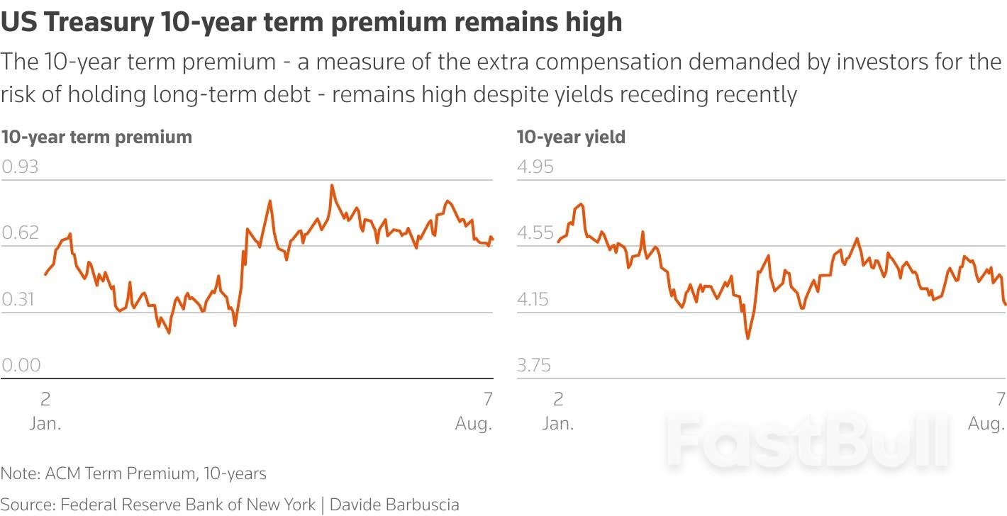 The dollar is down about 10% this year against a basket of major currencies while Treasury term premiums - the extra compensation investors demand for holding long-term debt - are high, even as yields have recently dipped amid slowing economic growth.