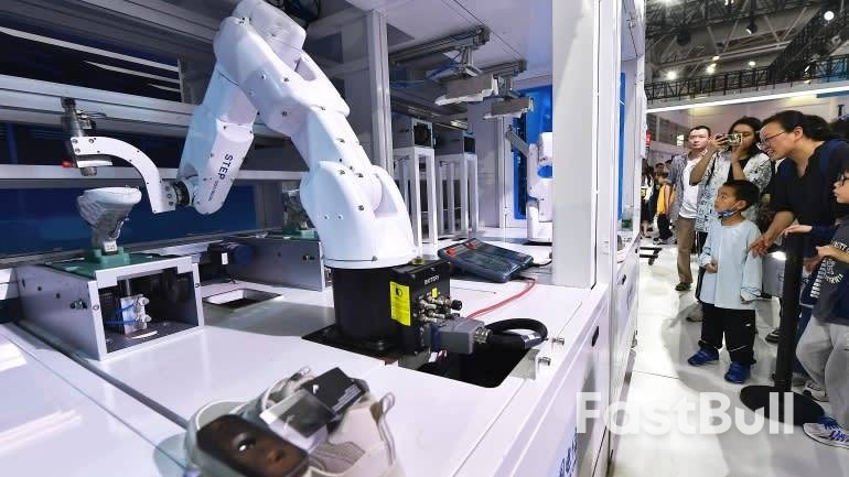 Visitors watch robots making shoes on a production line at an exhibition in Fuzhou, Fujian province, China. Footwear makers in Vietnam say the new U.S. tariffs have prompted them to accelerate their automation drives. © Getty Images