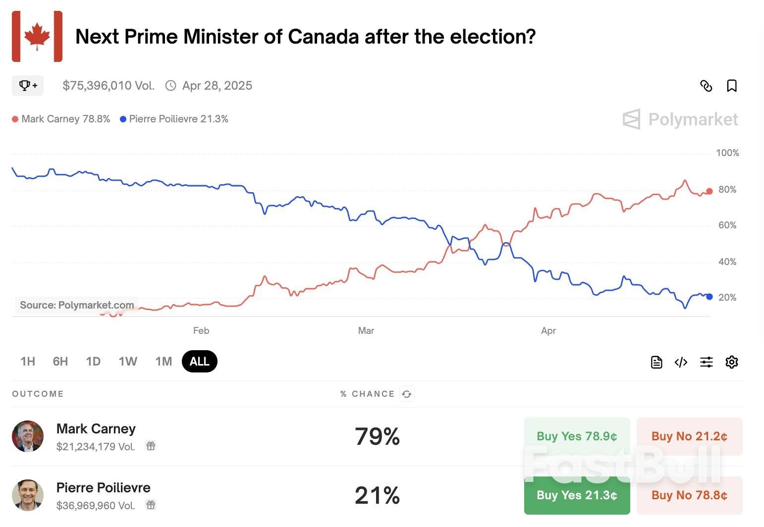 Polymarket chances favor the Liberal Party's Mark Carney over the Conservative Party's Pierre Poilievre to be the next Canadian Prime Minister.