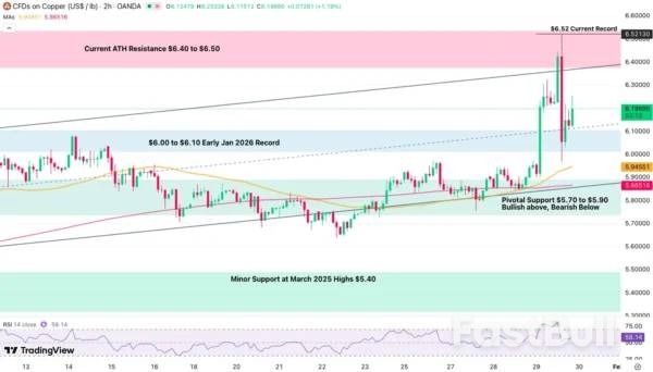 Copper spiked by 10% during overnight trading, corrects by a similar amount and is now holding tight at its January 14 record range ($6.00 to $6.10 Major Pivot).