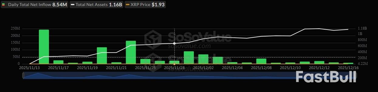 A potential yen carry trade unwind hasn't dented institutional demand for XRP-spot ETFs. The US XRP-spot ETF market reported net inflows of $8.54 million on Tuesday, December 16, bringing total net inflows to $1.01 billion. A 22-day inflow streak underscored robust institutional demand, supporting a bullish medium- to longer-term price outlook.