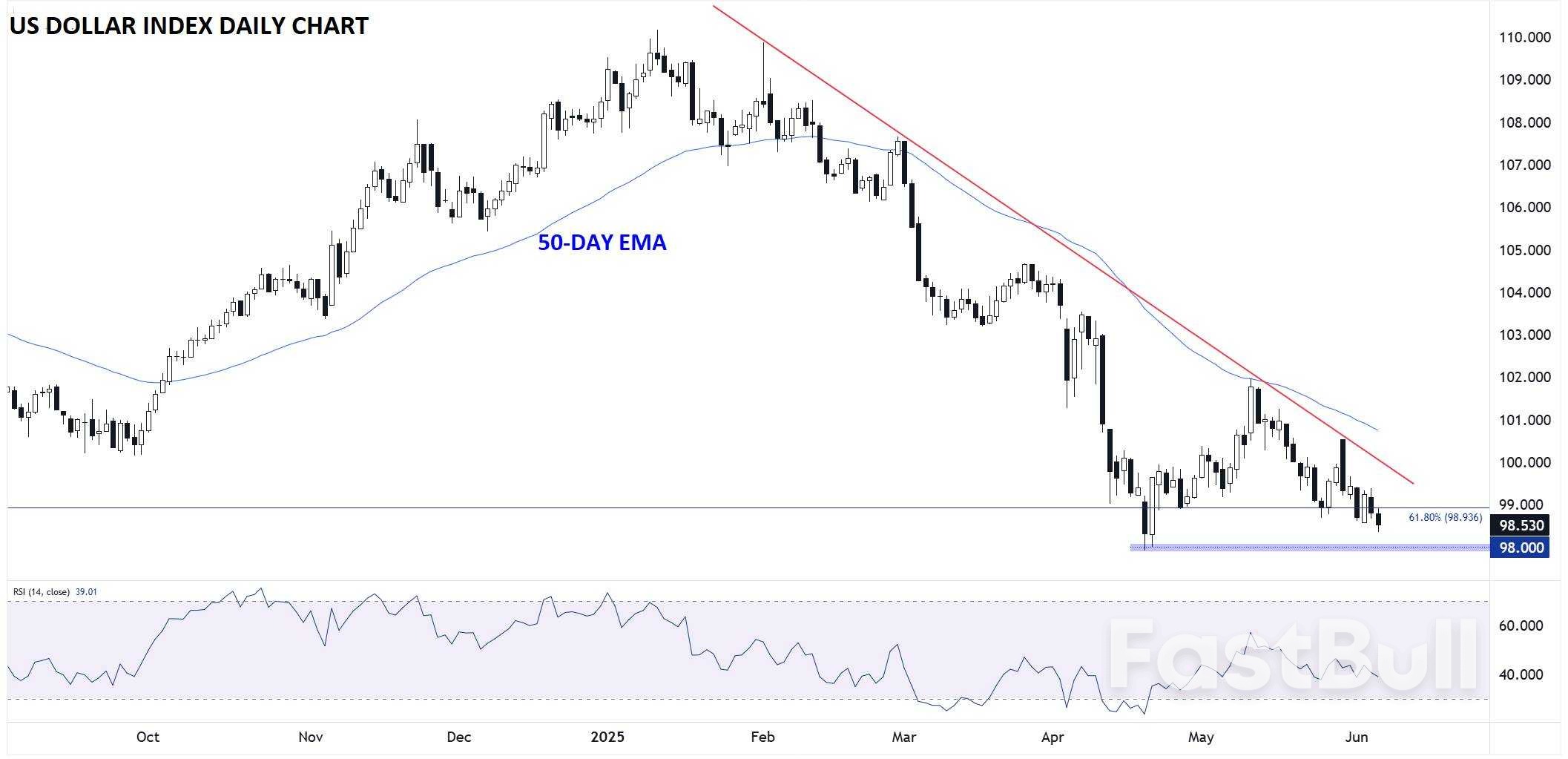The US Dollar Index (DXY) bounced through the first half of May before rolling back above to approach 3+ year lows near 98.00 as we go to press. The counter-trend bounce alleviated the oversold condition on the 14-day RSI, potentially setting the stage for another leg lower, especially if the jobs report comes in weaker than anticipated.