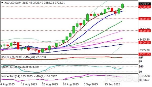 Daily studies remain firmly bullish and supportive for further advance, with immediate targets at $3734 and $3750, guarding $3789/$3800 zone.