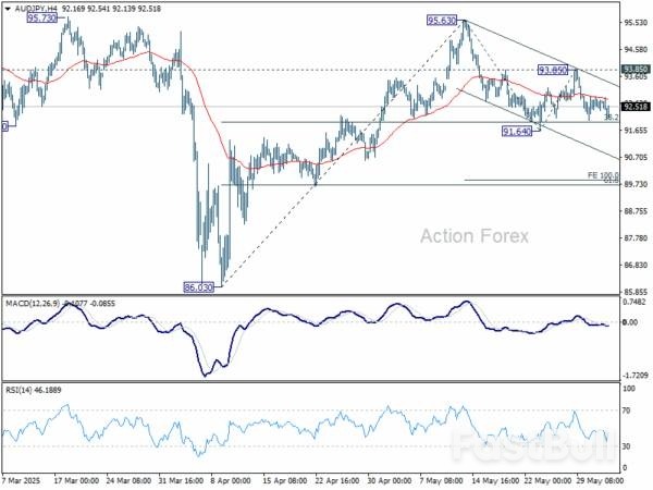 Technically, AUD/JPY continues to press 38.2% retracement of 86.03 to 95.63 at 91.96. Firm break of this fibonacci level will extend the correction from 95.63 to 100% projection of 95.63 to 91.64 from 93.85 at 89.86. Nevertheless, strong bounce from current level, followed by break of 93.85 resistance, will argue that rise from 86.03 is ready to resume through 95.63.