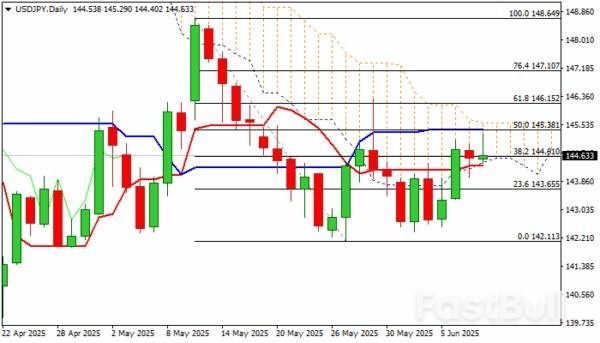 USD/JPY ranges within daily cloud (144.43/145.59) also between daily Tenkan and Kijun-sen lines, with Kijun-sen (145.38) capping the action today.