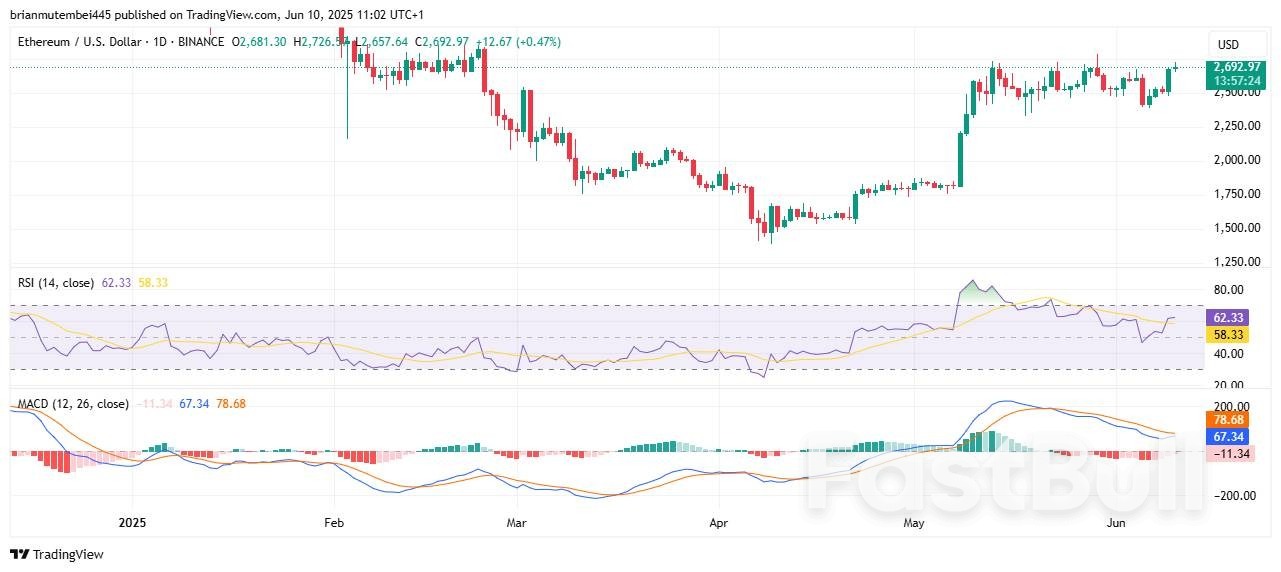 According to the Binance chart, from early 2025 until June 10, Ethereum went from a low of $1,500 to trading close to $2,679. The current RSI number is 61.69, so the price movement is overbought, and this could slow down the market or result in a brief price fall.