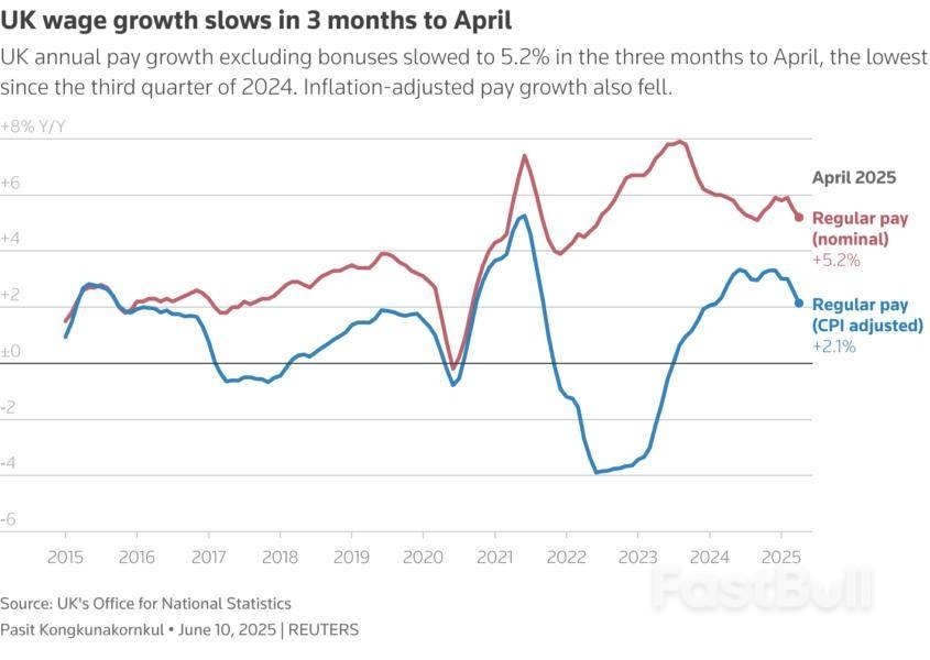 British wages rose by a slower-than-forecast 5.2% in the three months to April, pushing sterlingdown 0.4% against the dollar to $1.3499.