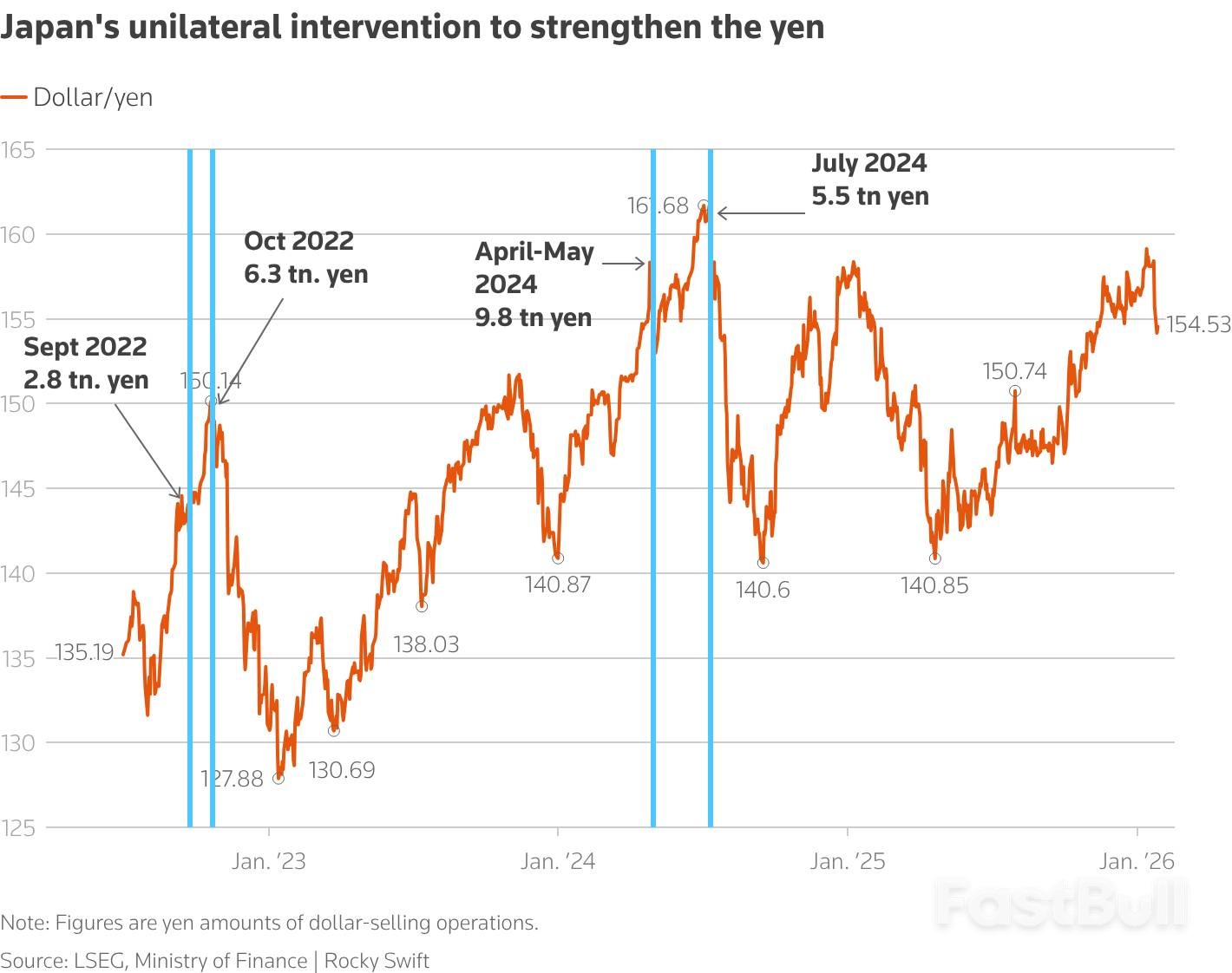 • Massive Spending, Limited Effect: In 2024, Tokyo spent a record 15.3 trillion yen to stop yen selling, driven by diverging monetary policies between the Fed and the BOJ. After an intervention in late April of that year, the yen was hitting new lows again within two months.