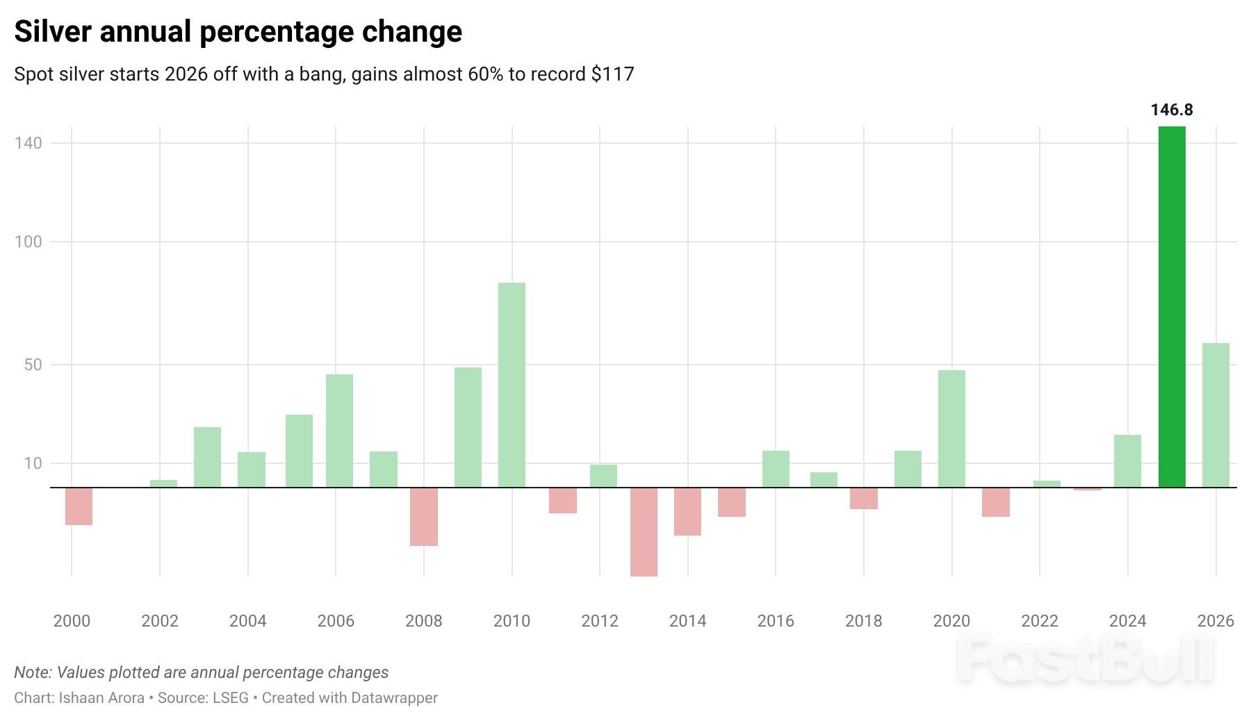 Silver has also experienced a dramatic surge, with spot prices jumping 6.1% to $110.19 an ounce. This follows a record high of $117.69 set on Monday. So far this year, silver is up more than 50%.