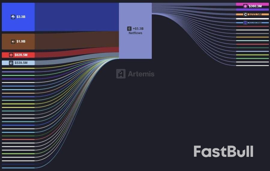 Source: ArtemisBitcoin was in second place at $1.9 billion, with Solana and Arbitrum coming third and fourth, with $628.5 million and $539.5 million, respectively. The other $360.3 million of ETH inflows was deployed into Ethereum-based protocols for use in DeFi, staking platforms, and stablecoin liquidity pools.