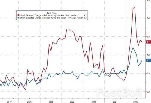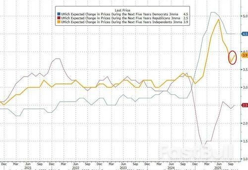 Year-ahead inflation expectations ebbed from 4.7% last month to 4.6% this month. These expectations are currently midway between the readings seen a year ago and the highs seen this year in May in the wake of the initial announcements of major tariff changes. Long-run inflation expectations increased from 3.7% last month to 3.9% this month but remains below this year's high point seen in April.