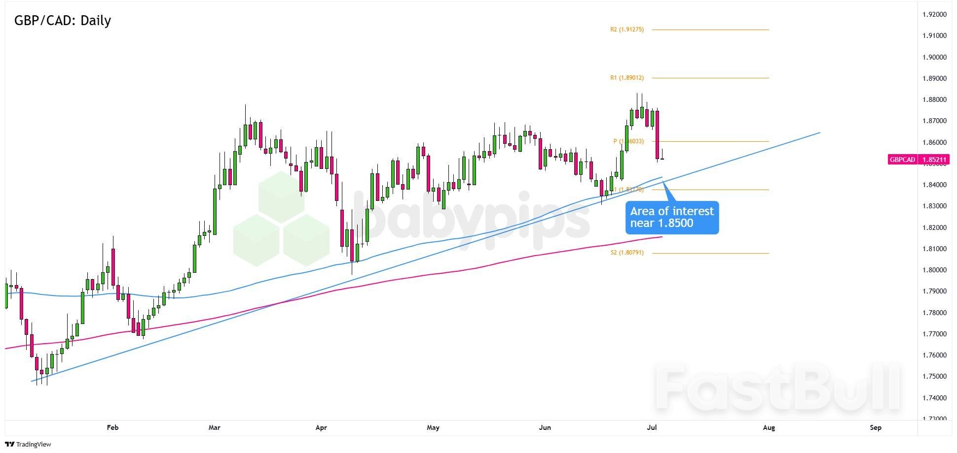 GBP/CAD is closing in on the 1.8400 to 1.8500 zone, a key support area that lines up with the S1 Pivot Point at 1.8377, the 100 SMA, and a trend line that has kept sellers in check since January.