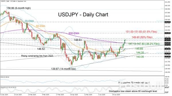 USD/JPY advanced above its 200-day exponential moving average (EMA) for the first time since February on Tuesday, while slightly extending its ascent to a new three-month high of 149.17 earlier today before losing momentum.