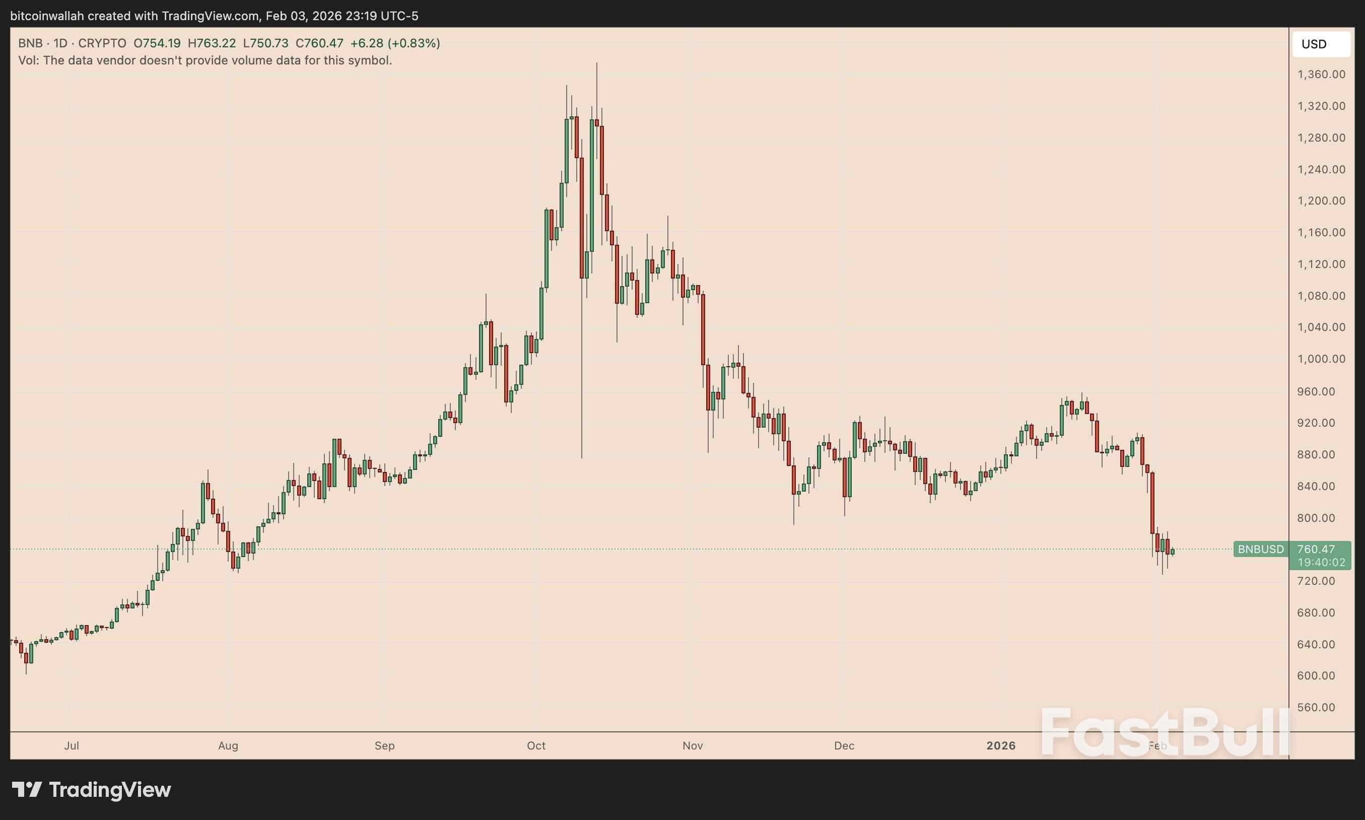 BNB (BNB), a Binance-tied cryptocurrency, may plunge by another 15% in February, continuing its slide from the October top above $1,300 and now struggling to hold above the $750 support level.