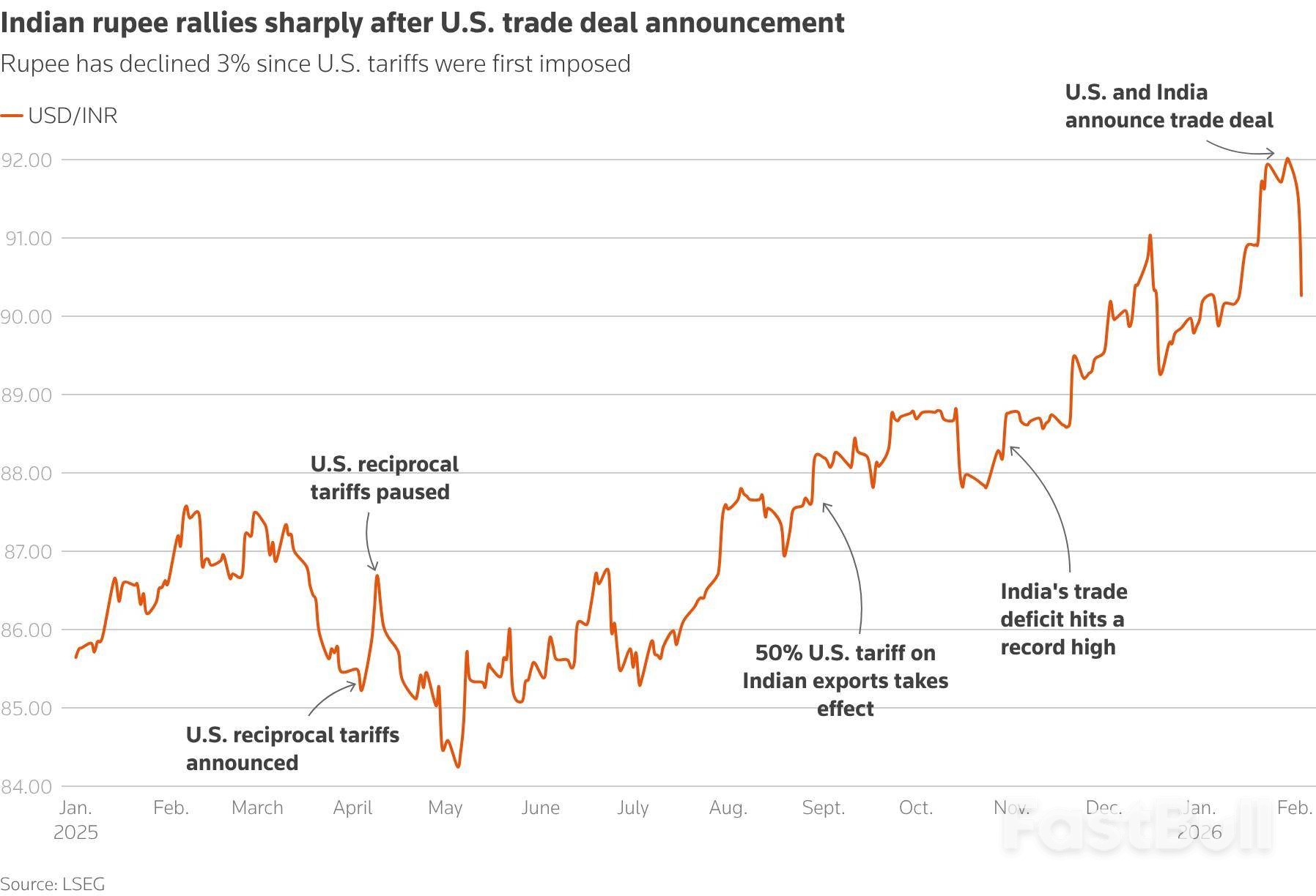 Lingering uncertainty over the trade deal had been a major headwind for the rupee. In January alone, the currency weakened by 2% and hit a record low of 91.9875 as foreign investors pulled approximately $4 billion net from stock markets.