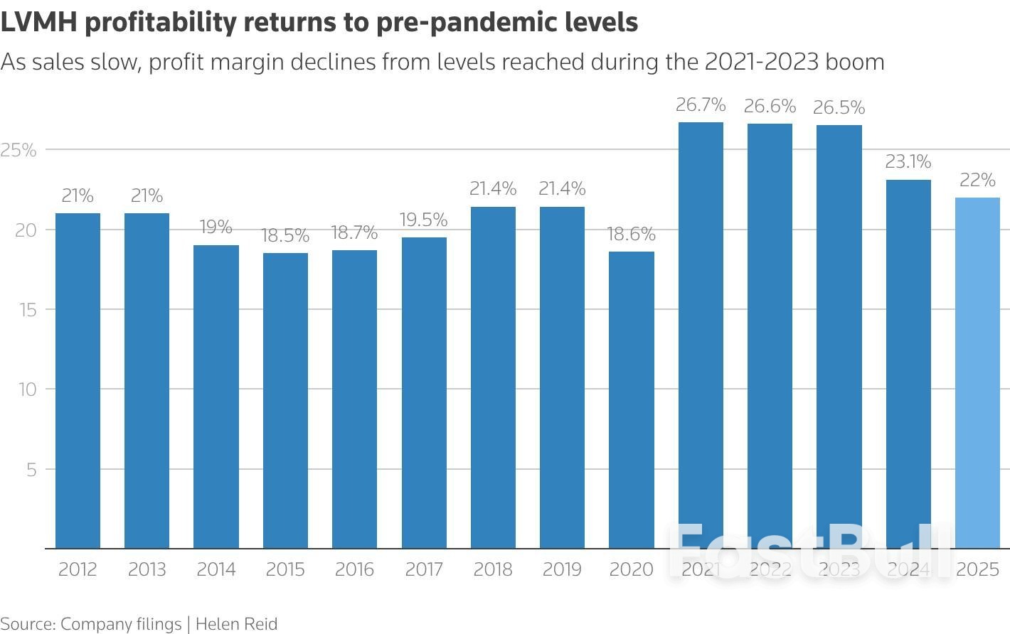Chart showing LVMH operating profit margin annually from 2012 to the estimate for 2025Second-tier cities such as Nanjing are becoming increasingly important to luxury brands as a growing contingent of middle-class people shun more economically developed first-tier cities such as Beijing and Shanghai to benefit from lower living costs.
