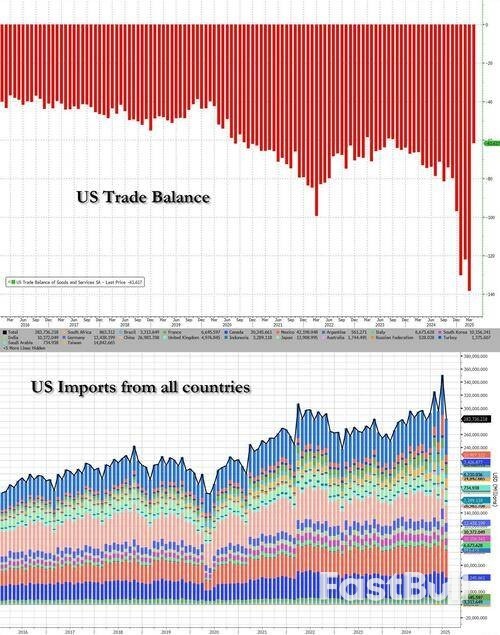 Trade data are going from lows to highs as well, which in some cases makes the Covid-episode data look pale. As the Commerce Department confirmed, the US trade deficit for April shrunk by the most on record, to $61.6bn from $138.3bn in March, driven by the largest-ever decline in imports.