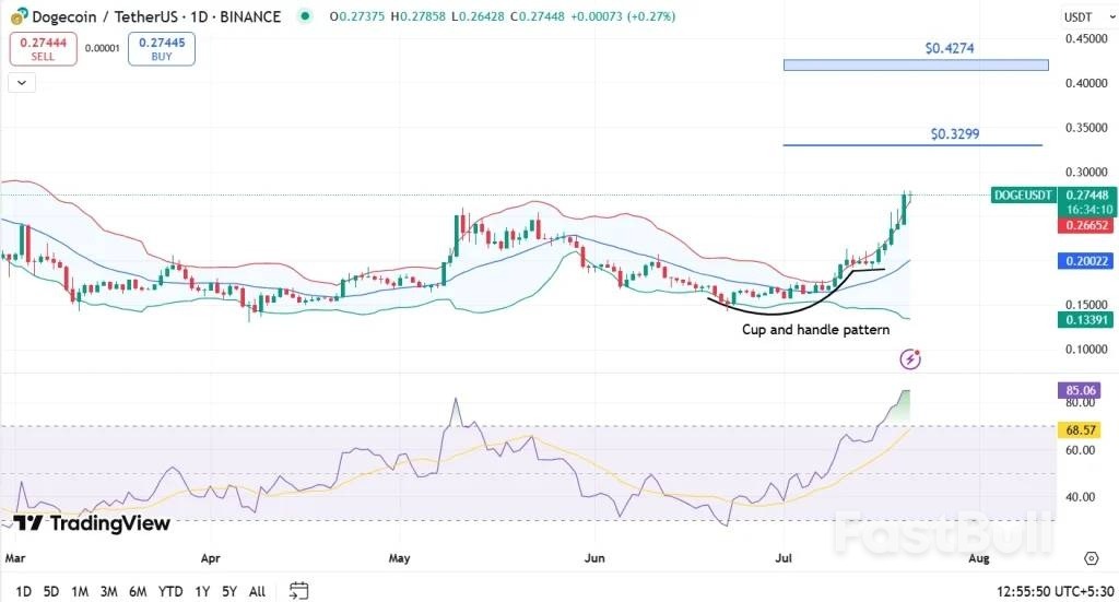 As evident from the chart that I have shared, the breakout from the cup and handle formation suggests a measured target near $0.3299. Successively, Dogecoin could also have a further upside potential toward $0.4274 if momentum sustains. Talking about indicators, the Bollinger Bands are expanding rapidly, confirming rising volatility and buying pressure. RSI stands at 85.06, signaling extreme overbought conditions.
