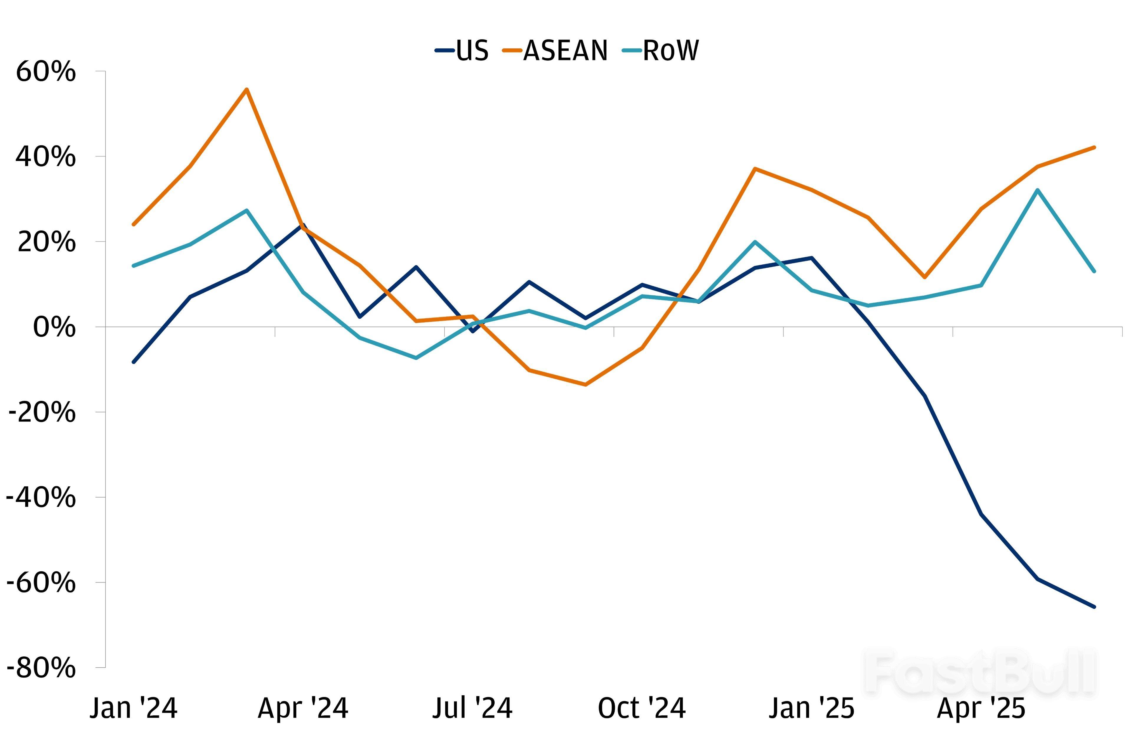 Despite the pressure from U.S. tariffs, China's export engine has proven remarkably durable. According to JPMorgan Private Bank's latest Asia outlook, China’s real exports are on track to grow by about 8% in 2025, with its global market share expanding to roughly 15%. This has occurred even as its U.S.-bound exports have fallen to less than 10% of its total.