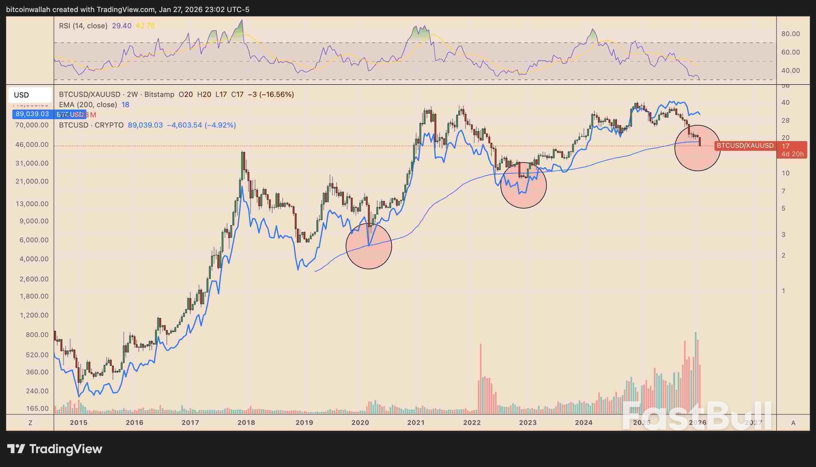 Traders are also tracking Bitcoin's performance against gold, a ratio some view as a cleaner long-term cycle gauge than BTC/USD.