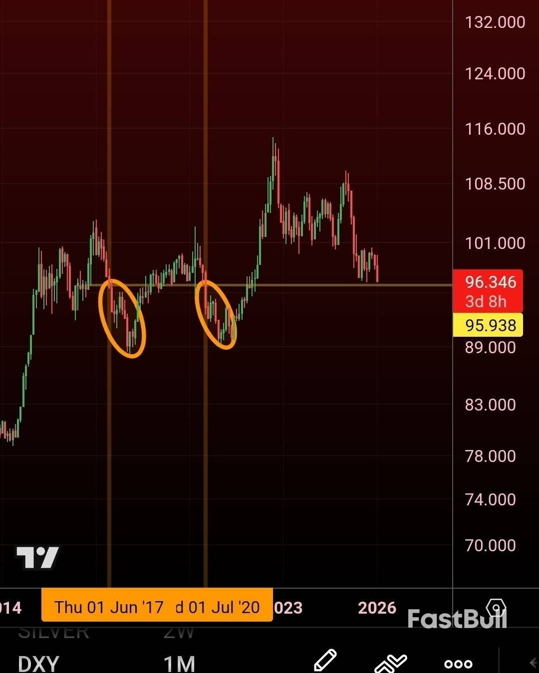 Against that backdrop, DXY now sits within striking distance of 96, a level that acted as a major inflection point in prior cycles.