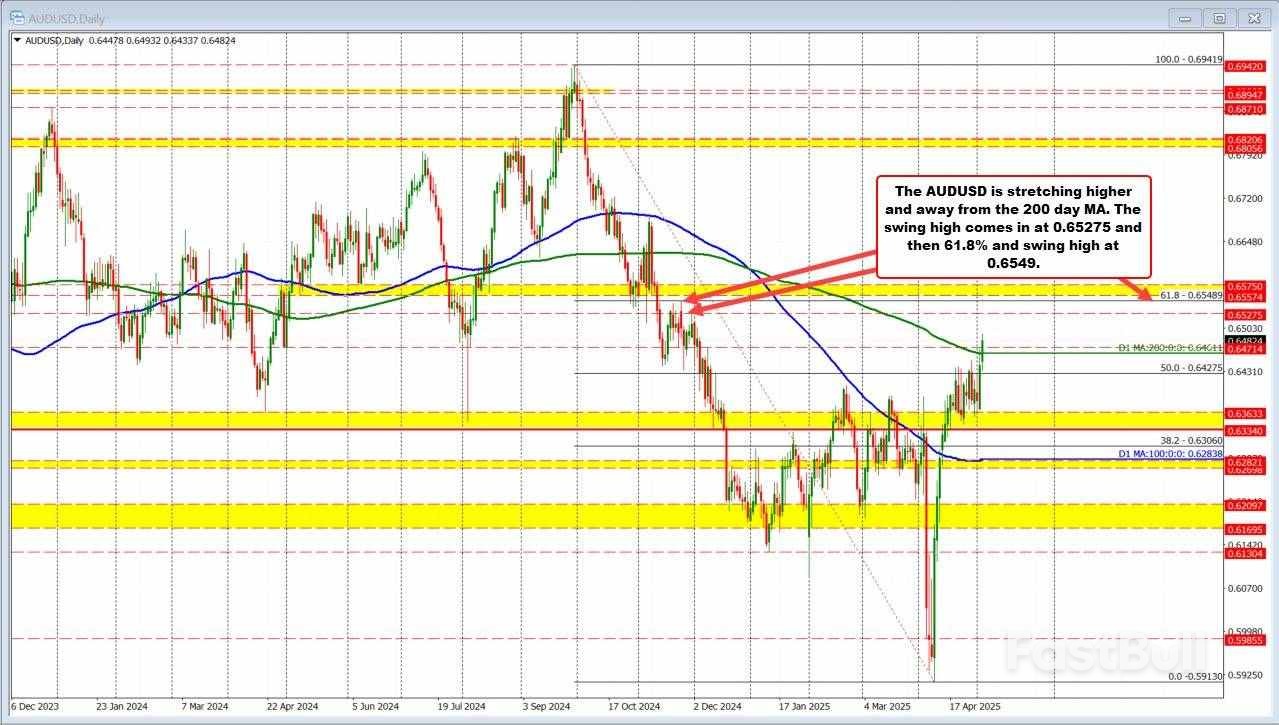The AUDUSD is surging higher today and has convincingly broken above its 200-day moving average at 0.6461—a key technical milestone. On Friday, the pair briefly traded above this level for the first time since November 8, 2024, but bullish momentum faded, and the price settled back into a familiar swing area between 0.6427 and 0.6441. The Friday close landed near the upper end of that zone at 0.6441.