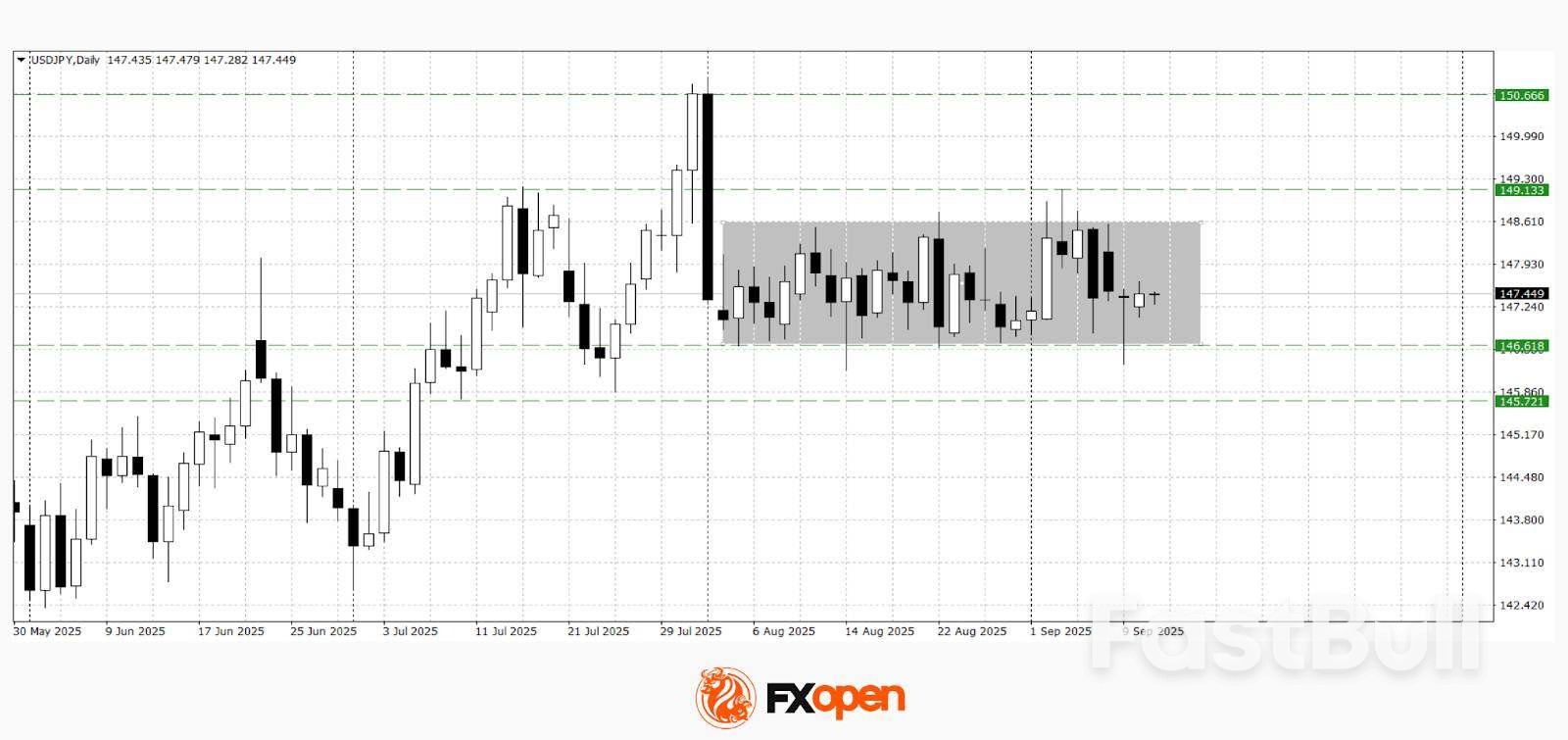 Despite disappointing US employment data released at the end of last week, USD/JPY continues to trade within a six-week range of 146.40–148.60. Early this week, sellers attempted to break through the lower boundary of the corridor but have so far been unsuccessful. Technical analysis of USD/JPY suggests a possible strengthening towards 148.00–148.60, as a hammer candlestick has formed following the rebound. A bounce from current levels could also lead to a retest of support at 146.30–146.60.