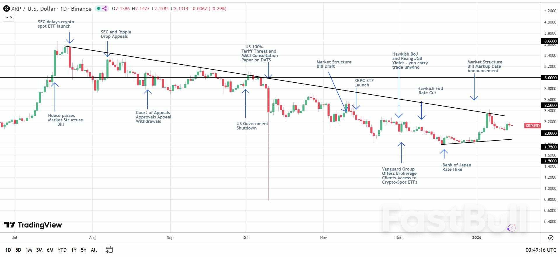 Hopes for crypto-friendly legislation sent XRP to a January 6 high of $2.4151 before briefly dropping below $2.1.