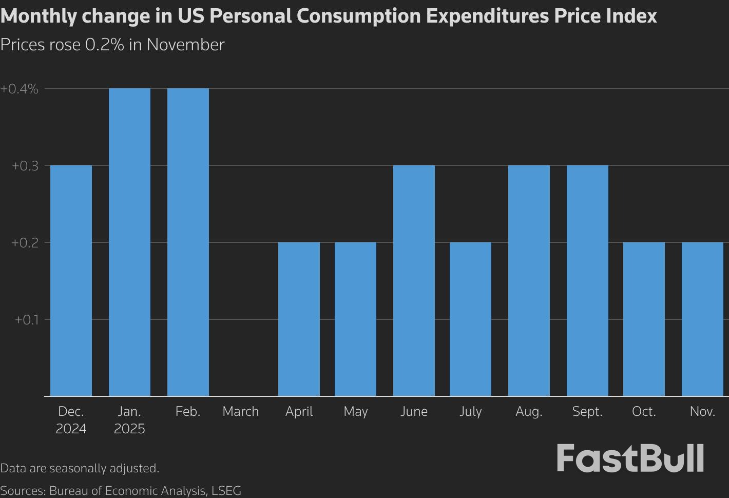 The PCE price index increased by 0.2% in November, matching October's gain. On a year-over-year basis, it rose 2.8%.