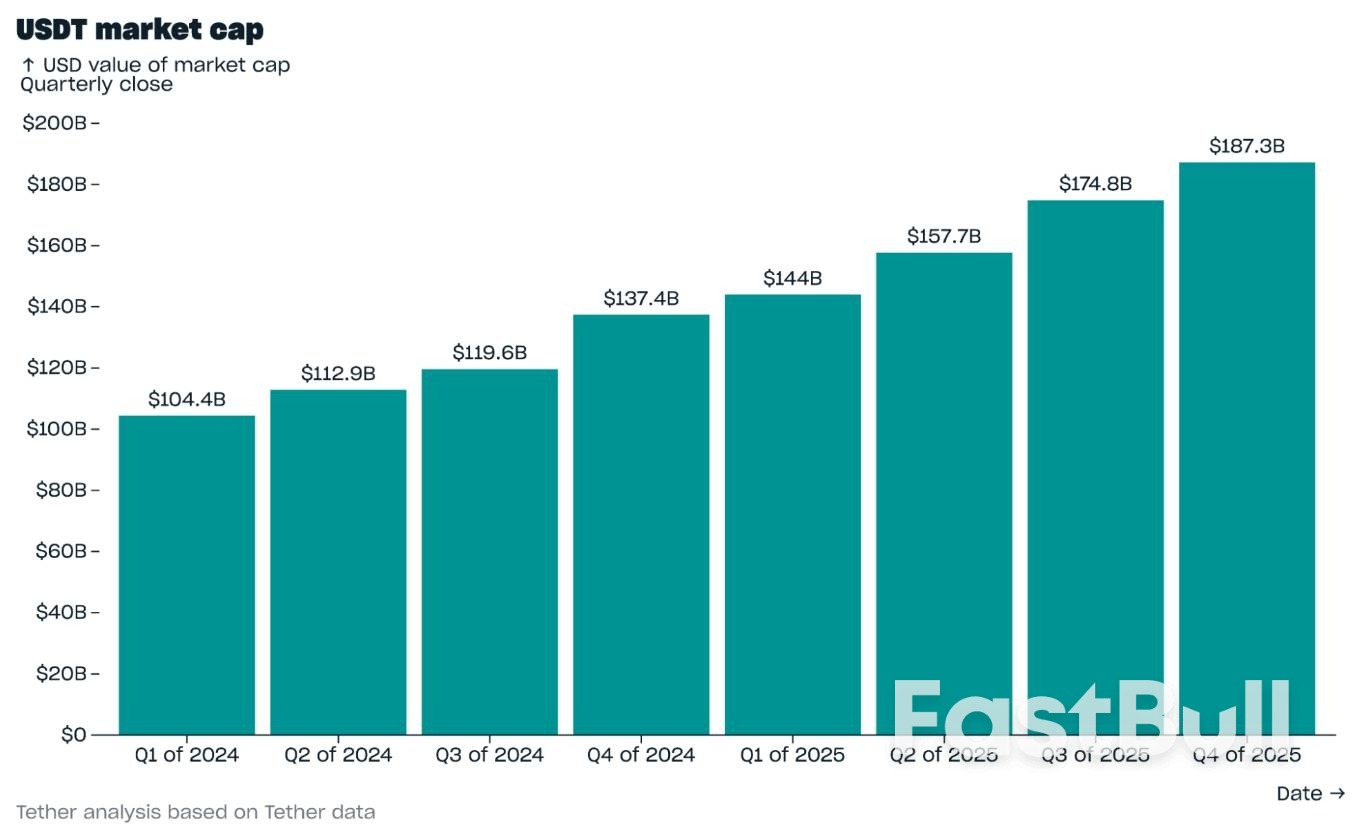 Tether's dollar-pegged stablecoin USDt expanded to a record $187.3 billion market capitalization in the fourth quarter of 2025, even as the broader crypto market slid following October's liquidation cascade.